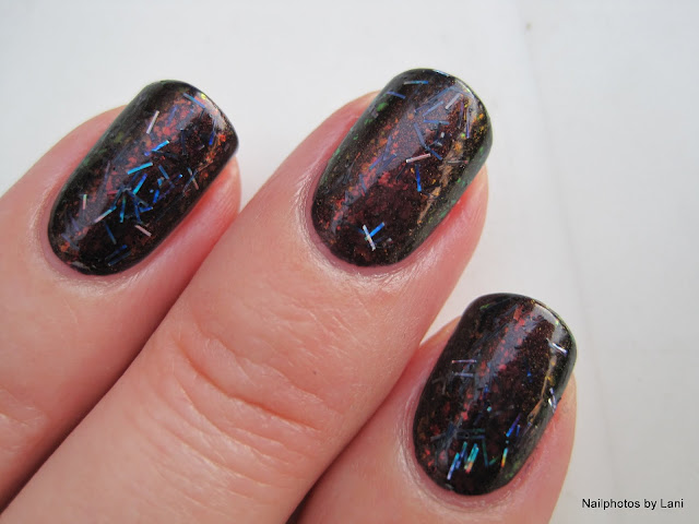 I like that the mostly blue color of the bar glitter makes the redness of the flakies and the base more visible. I will probably try Sunglasses at Night over black some time to see what it looks like in person, but I'm not used to black nails, so I will probably wear this glitter over dark red or purple. It is the kind of holographic glitter that makes you move your hands and look at your nails and the changing color all the time. I wish the base was clear, but am glad that it isn't black. Next time I will use 3 coats, and then I'll see how dark the base gets. Sunglasses at Night is from this summer's Flash Glam FX Collection.